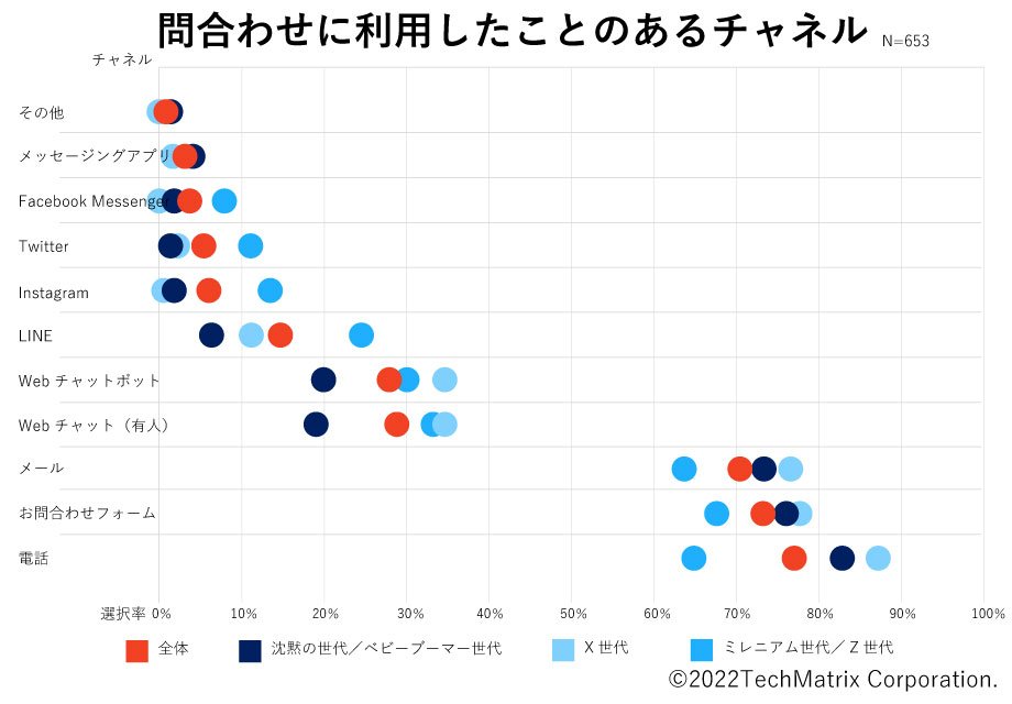 テクマトリックスが実施したWebアンケート(※1)によると、企業への問合わせに利用したことがあるチャネルとして「電話」の選択率が30代では69.7%だったのに対し、60歳以上では82.6%と、世代が上がるにつれてデジタルチャネルよりも電話での問合わせを好む傾向があることがわかりました。