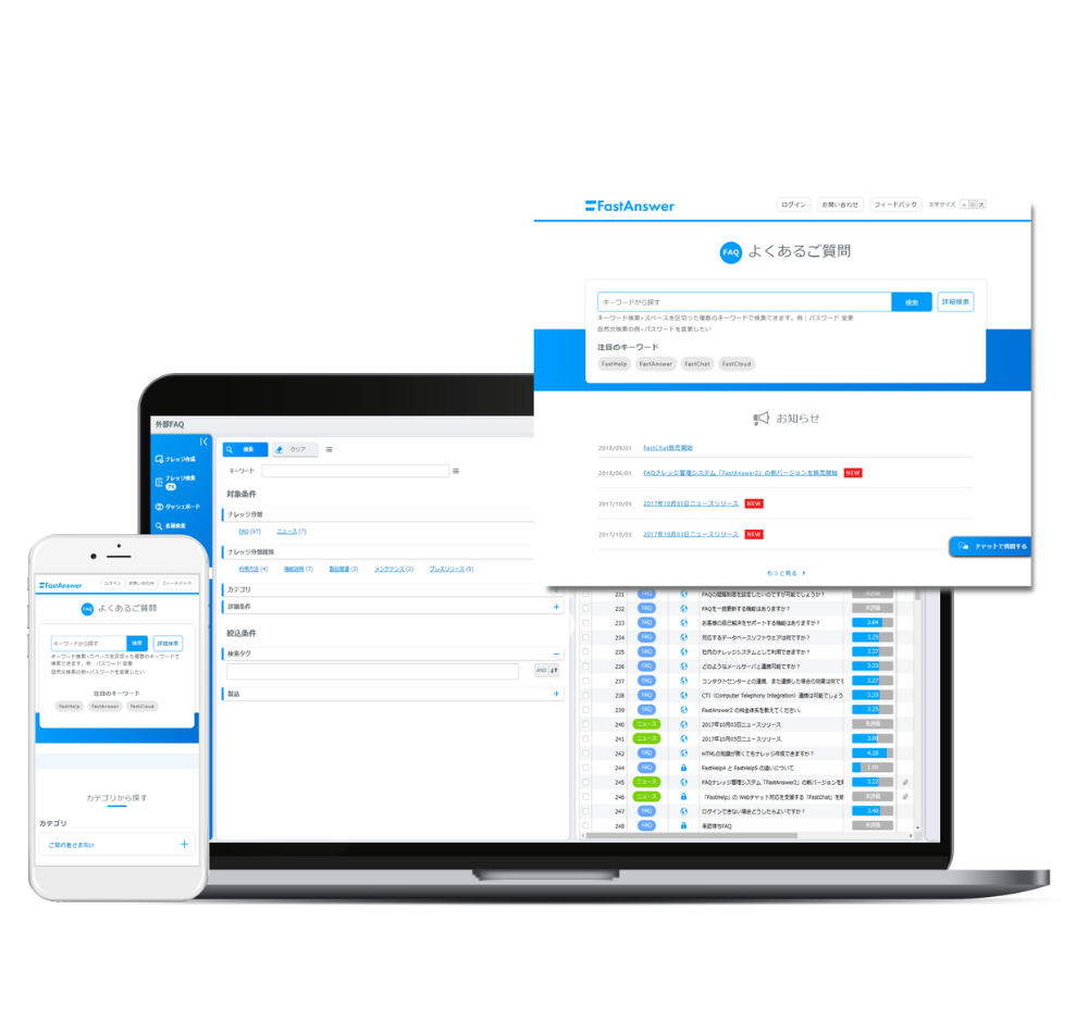 マルチデバイス/マルチサイト対応- 複数のナレッジサイトをワンシステムで、一元的に管理(マルチサイト対応)することができます。 また、外部向けサイト(外部サイト・企業Webサイト)では、PC・スマホなどのデバイスごとに表示を最適化するレスポンシブ対応を標準装備しています。