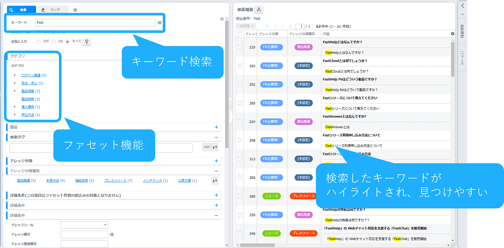 高度な検索機能- 検索スキルによらず、問題解決に必要な情報をすぐに探し当てることができるよう、検索機能が充実しています。
