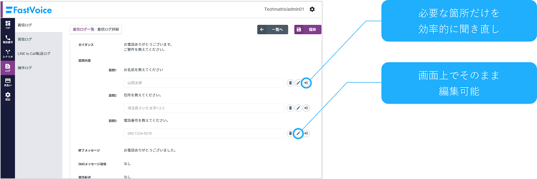• 通話の最初から最後までの音声をログファイルとして出力でき、お客さまの声として製品企画や運用改善に活かせます。