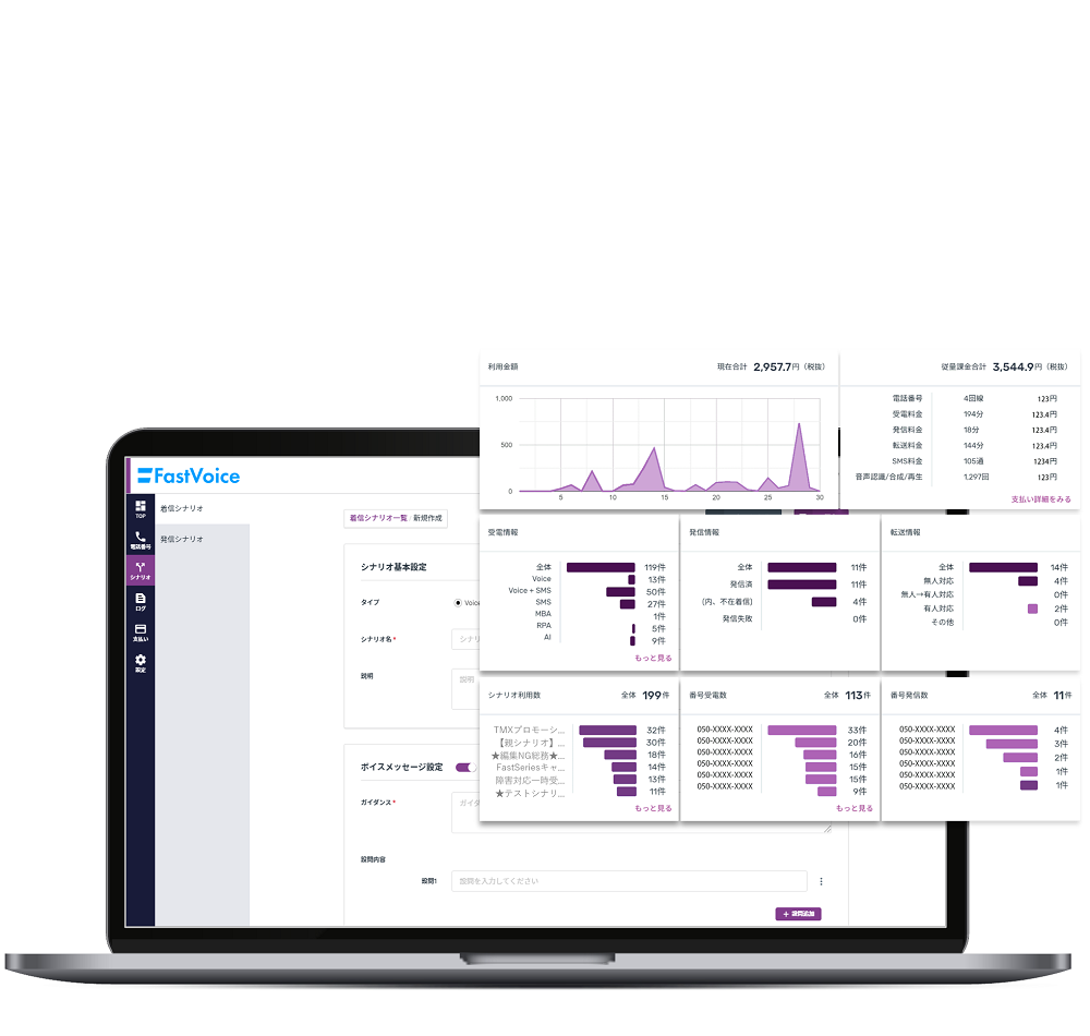 • 現在の利用料金や、シナリオ・電話番号ごとの受電数、日別・時間別の受電・発信状況を確認できます。日々のモニタリングにより、将来の電話問合わせのトレンド予測やSV・オペレーターのワークフォースマネージメント(WFM)も可能にします。
