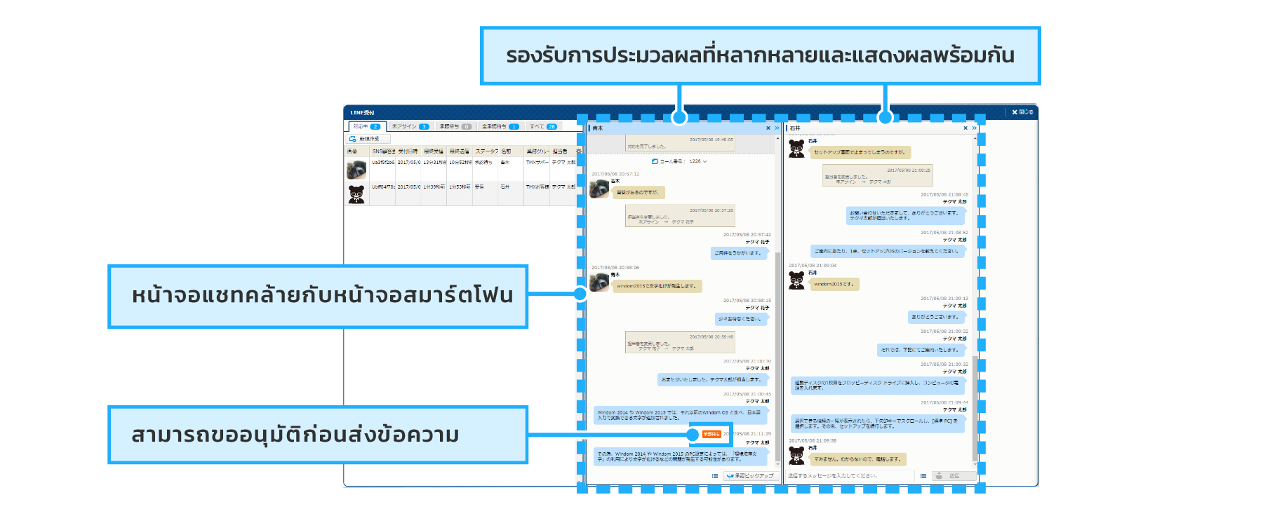 • ด้วยอินเทอร์เฟซผู้ใช้ที่ใช้งานง่าย เจ้าหน้าที่สามารถตอบข้อซักถามของลูกค้าจากช่อทาง SNS ได้อย่างราบรื่น เจ้าหน้าที่สามารถตอบคำถามและบันทึกประวัติการติดต่อได้อย่างง่ายดายเช่นเดียวกับการตอบคำถามผ่านทางโทรศัพท์ อีเมล เว็บแชทและช่องทางอื่น ๆ